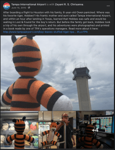This opportunity to showcase customer service was done with that “just right” vibe. Tampa International Airport didn’t make this story about themselves like a “look at me” moment, but rather they focused on the stuffed tiger’s family, opting to keep the story and subsequent attention simple and personal which encouraged other customers to share their own feel-good stories on social media and tagging @FlyTPA so Tampa International Airport could share in their positive experiences (Big Adventure, n.d.).