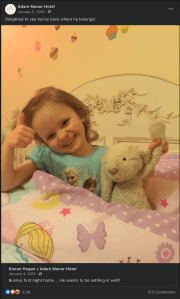 A year later, a similar tale popped up at a hotel in Ireland. A little girl lost her beloved stuffed bunny at Adare Manor Hotel in Adare, Co. Limerick, Ireland. The hotel shared photos of the bunny enjoying its stay at the hotel, indulging in spa treatments, afternoon tea, and the like. Adare Manor Hotel shared the photos over several days before it was shipped off to its owner. The hotel received double the amount of engagement on these posts and even a few news outlets picked up the story.